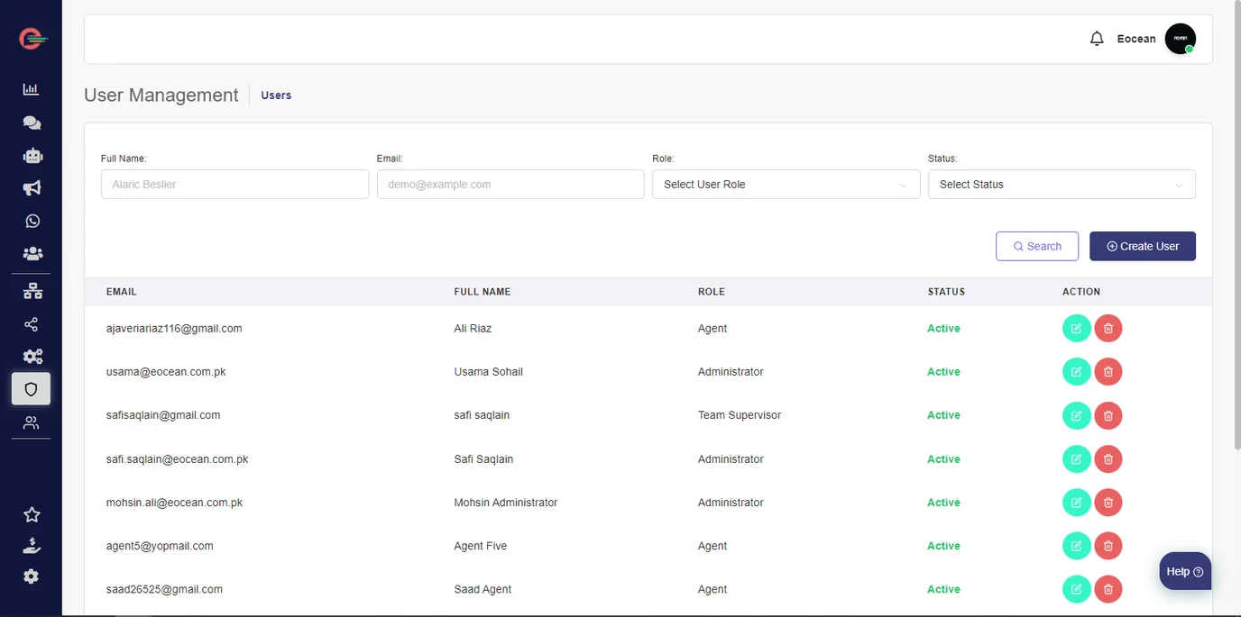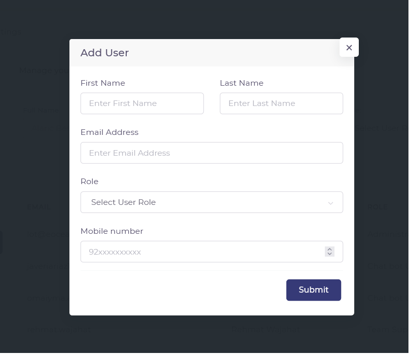 Fill in the agent’s or team supervisor’s name, email address, role ( each user role has different permissions in Digital Connect) , and mobile number and click Submit.